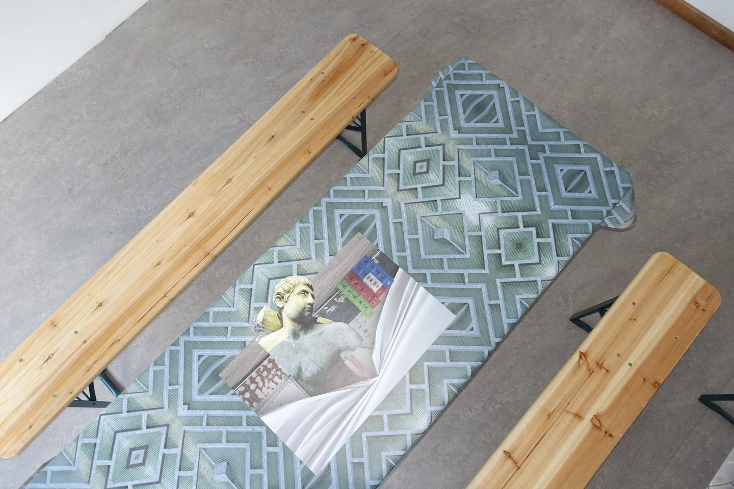 Considering sculptures as arranged objects that produce awkward compositions questions the great lack of dissident presences in the clean European streets crossing and forming in ninety degrees. This specific regard to the artwork conducts our own ecology of means and disputes the consideration of the archive. A tight production budget will cover people's living, and a tighter one the double negative production: twice the same, but not exactly; two copies where you won't find an original; being indexed twice in a couple of debutant archives; goodbye Fed Ex!
