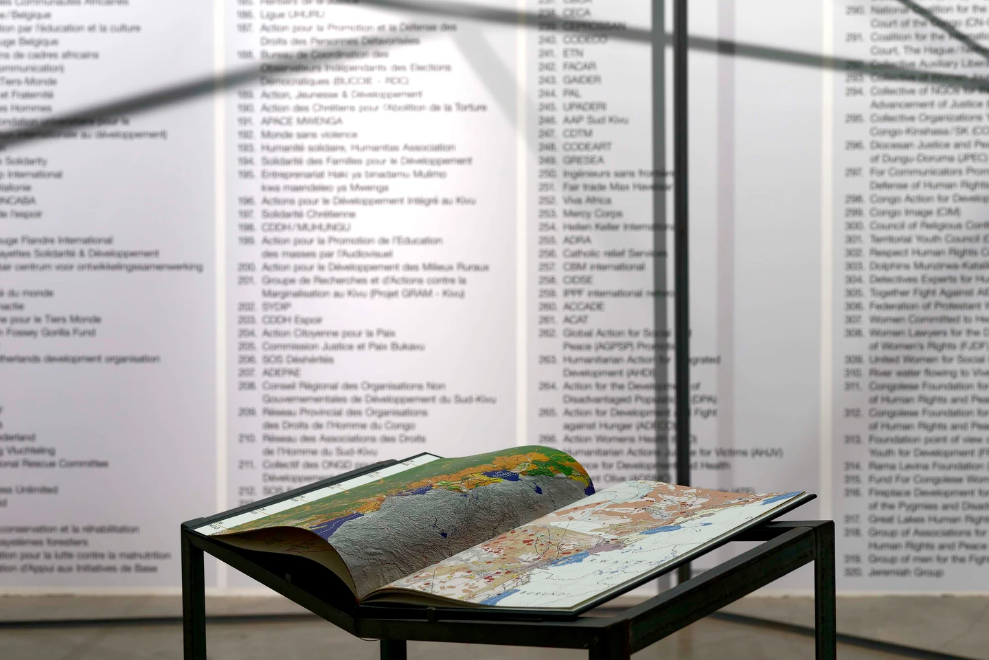 Installation comprenant The Album, une série de collages photographiques (40 x 55 cm chacun) et une sculpture en métal (400 x 550 cm), et Hunting & Collecting, un livre d’artiste (32 pages, 37,5 x 31 cm), une impression photo listant les ONG du Nord et Sud Kivu (dimensions variables) et des photographies d’archives courtesy American Museum of Natural History, New York et Royal Museum for Central Africa, Tervuren