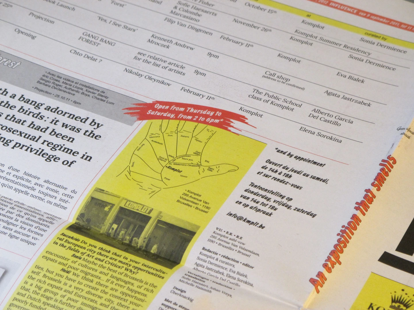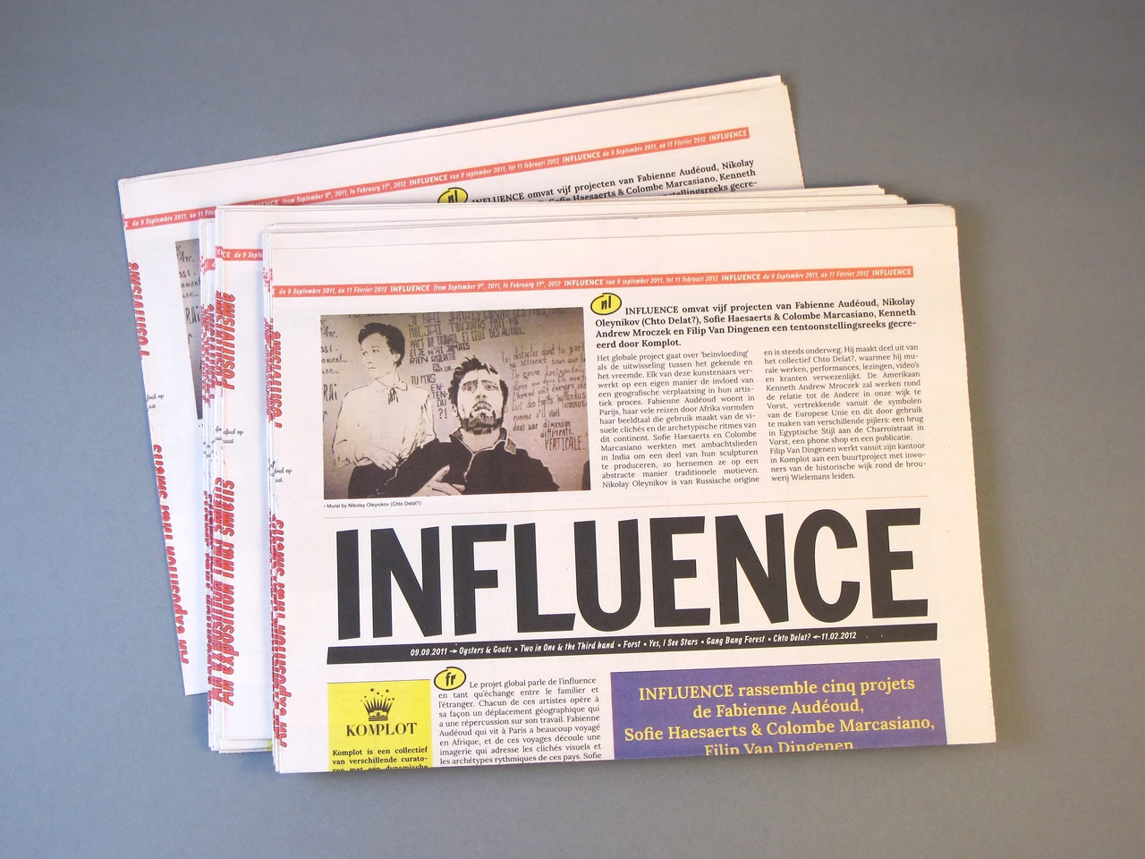 INFLUENCE brings together five projects by Fabienne Audéoud, Chto Delat?, Sofie Haesaerts & Colombe Marcasiano, Kenneth Andrew Mroczek and Filip Van Dingenen in a series of exhibitions developed by Komplot. Each project will design its own rules of engagement with divers participants, evolving around different types of collaborations - between artists and curators, local residents, students, artisans and craftsmen. Emphasizing mutual and reciprocal impact of different participants on the exhibitions' development, the projects essentially reflect on influence as an exchange between the foreign and the familiar. Ultimately, all projects exlore the boundaries between decisions, commitments and compliance within a habitual and a foreign context. The ideas behind the projects are further explored in publications and public events.