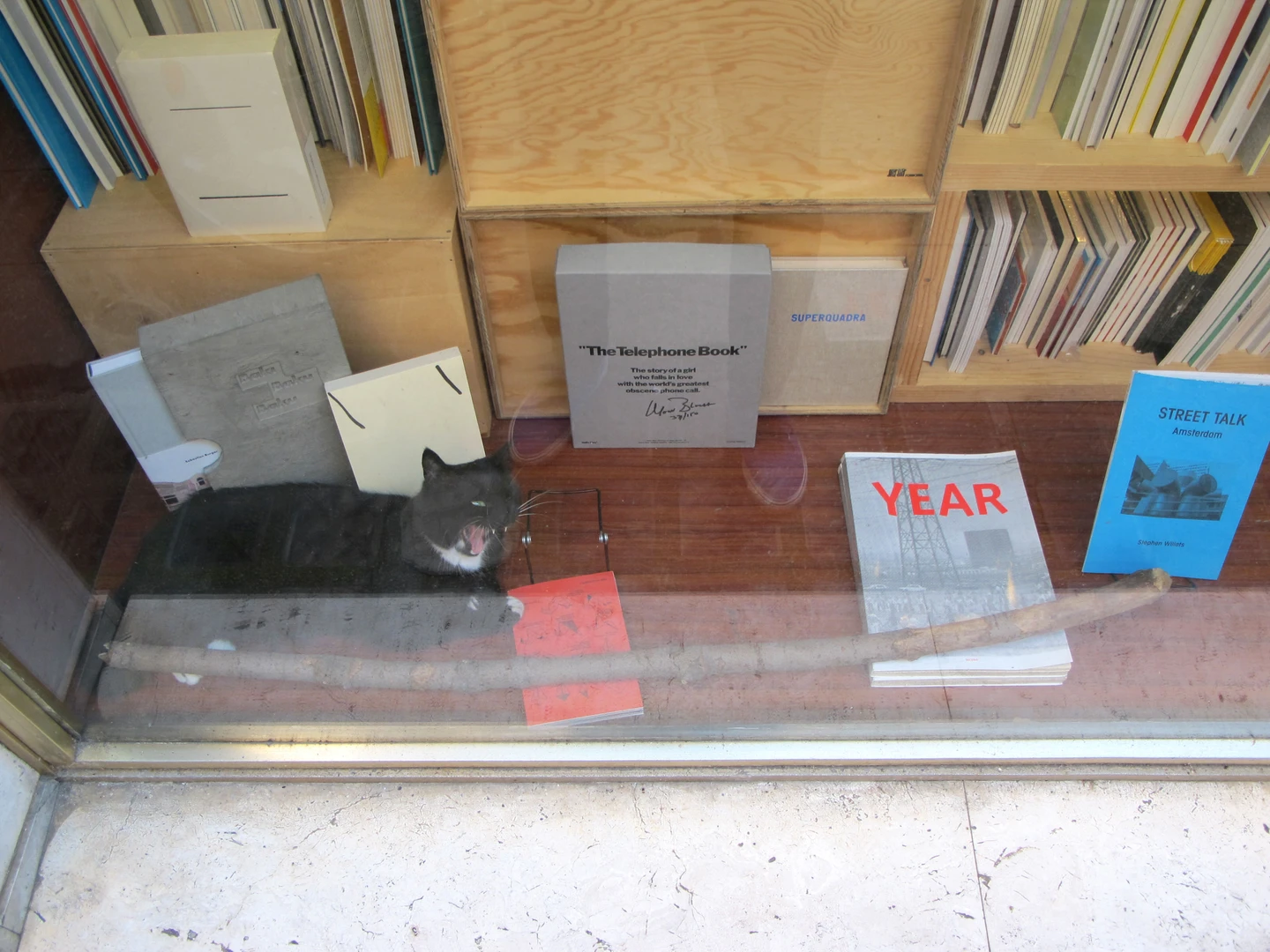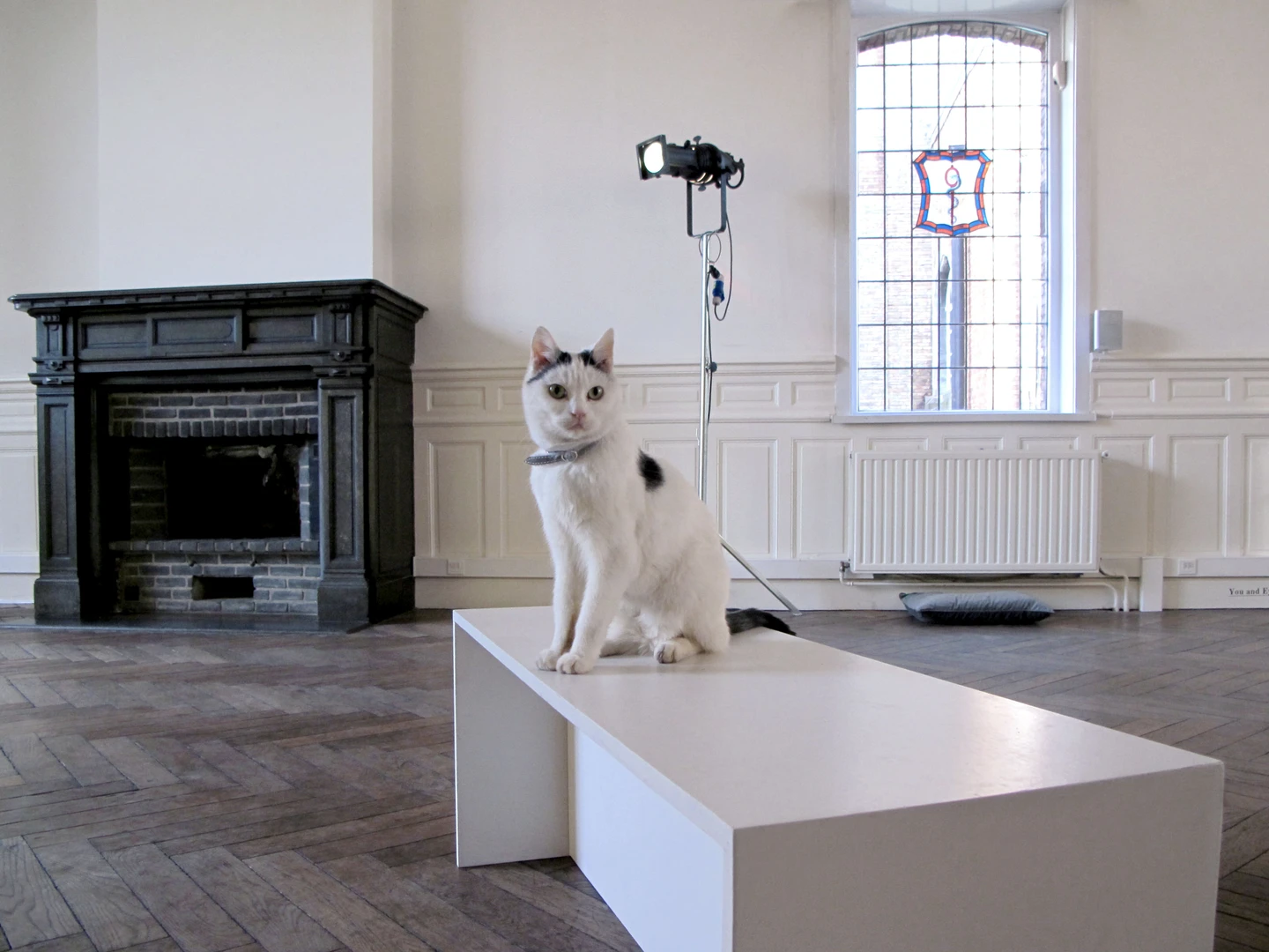 Milod's behavior at the shelter was quite surprising. He stoud on his 2 back feet in front of the glass door leading to the shelter's entrance hall, deep in thought. Next morning we noticed he had health problems: his nose, eyes, and ears were oozing profusely. His previous adopters had returned him for this reason. After two weeks with us, he was already better. Two more weeks at Komplot, being pampered by artists and curators there, he arrived to the Hisk in top form. On opening night, he was fantastic, strolling serenely among the hundreds of the public's legs with his catcam; he perfectly fulfilled his role as The Visitor. But even though we had committed to adopting him permanently at the end of the exhibition (despite his bad habits of stealing food), we were inform that he naturally followed Willem XXX, within he formed a very close bond during the month the exhibition lasted. He leaved is last few years suroonded by care, love and art.