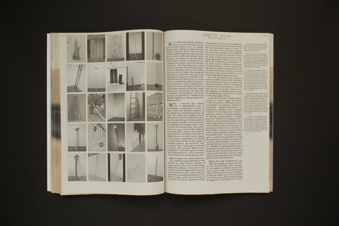YEAR is an annual magazine published by Komplot and David Evrard with the designers Pierre Huyghebaert and Uberknackig. YEAR is thought as a non-linear narrative inspired from the cause and effect paradigm or more. Its subjective approach, closely ingrained with the artists, curators and the experiences they raise, slips in commentaries or reports about different elements – exhibitions, interventions, conferences, books, objects...– that appear influential. YEAR is a choral publication of a kind of a scene and beyond. According to the principle of chain reaction YEAR addresses the journalistic model, organizing its content in the form of sequences. YEAR is a scene, an experimental constellation.